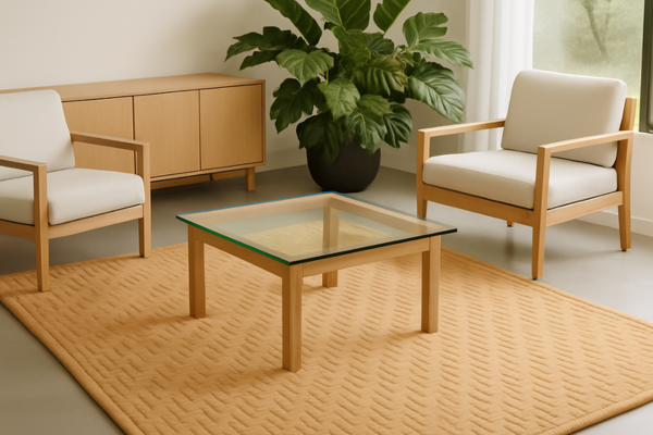 Tapetes trançados embaixo de uma mesa de centro de vidro.