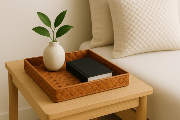 Uma bandeja com acabamento intrecciato é perfeita para organizar velas, livros ou até como suporte para bebidas em uma sala de estar.
