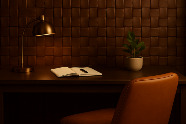 Use o intrecciato em painéis de madeira ou couro em paredes para criar um fundo rico e texturizado, perfeito para salas de jantar ou home offices.